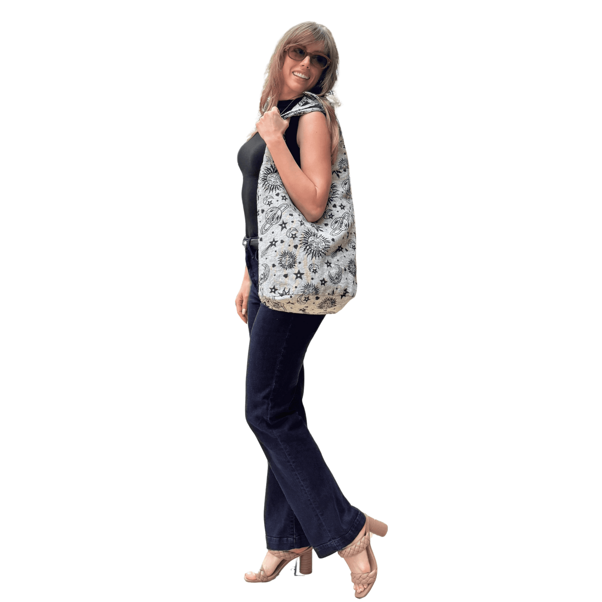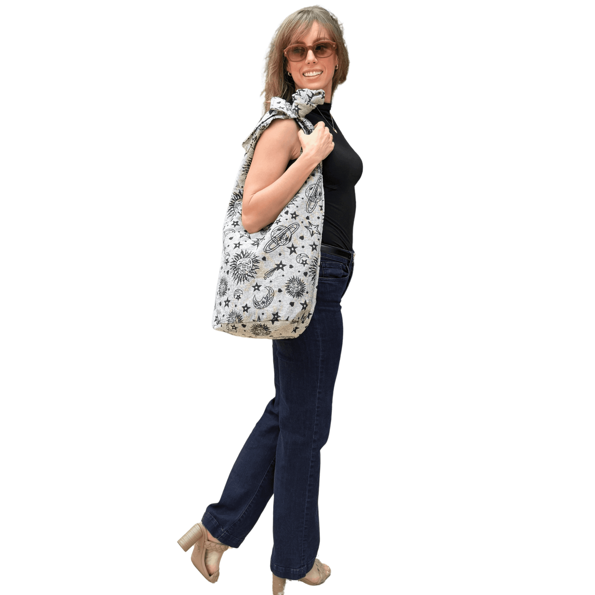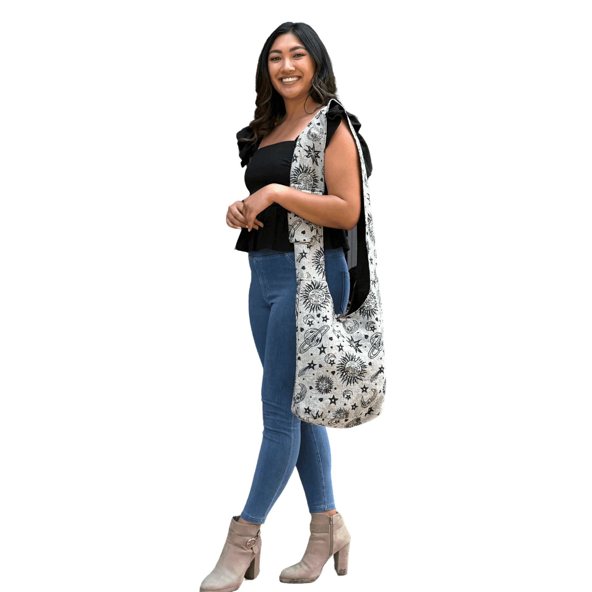 Bring a cosmic vibe to your everyday style with this Celestial Print Hobo Bag, handmade in Nepal using 100% cotton fabric. Featuring a dreamy star and moon design, this boho bag channels celestial energy while offering functionality you'll love on the go.
