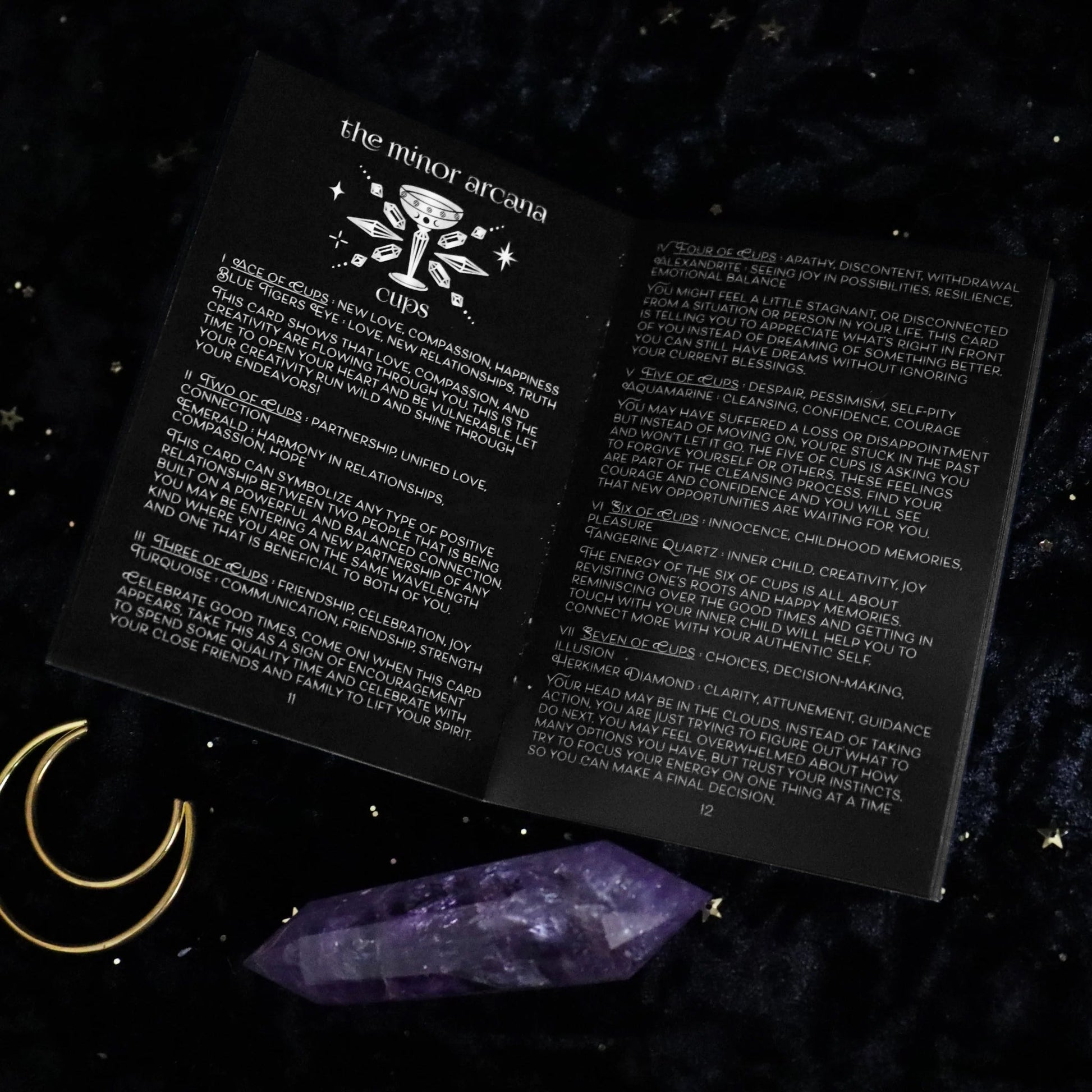 booklet for the gold deck is full color printed and has 26 pages, including an introduction, how to use, and keywords & paragraph descriptions for the card meanings along with crystal properties. does not include reverse meanings.