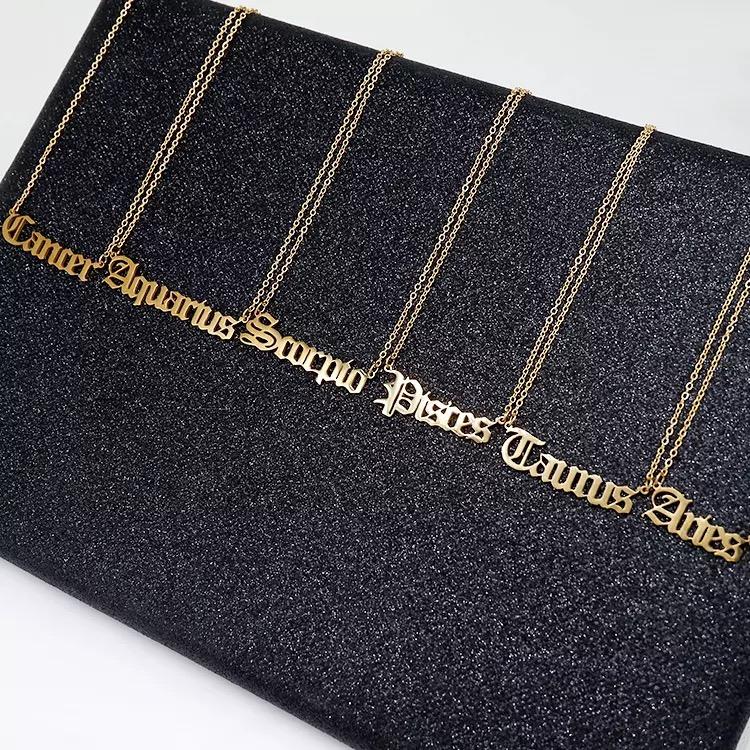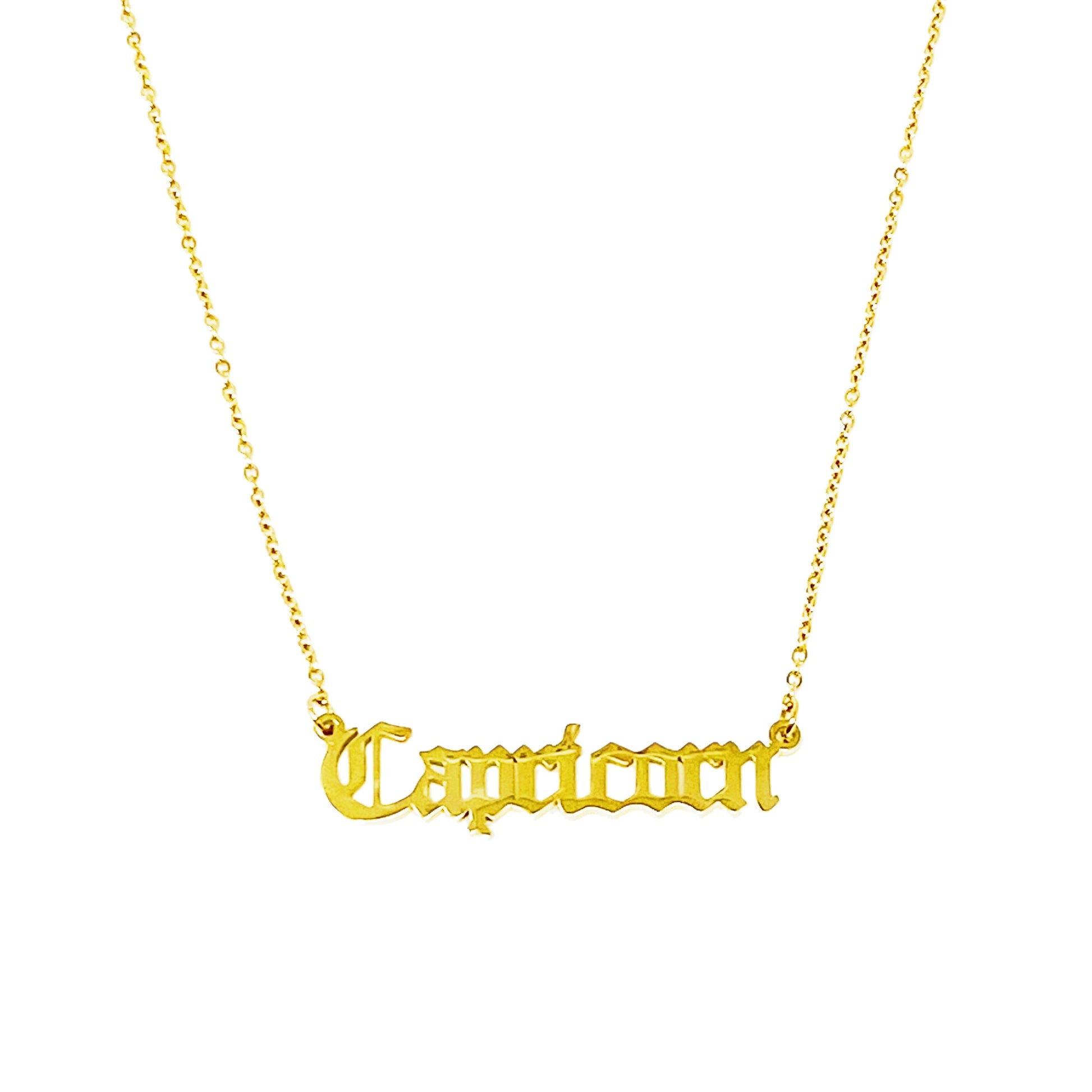 Now trending: zodiac names in an Olde English font. Each zodiac is beautifully lettered in a classy font, made with a dense, high-quality metal. Great to wear on its own or layer with any necklace in your collection!