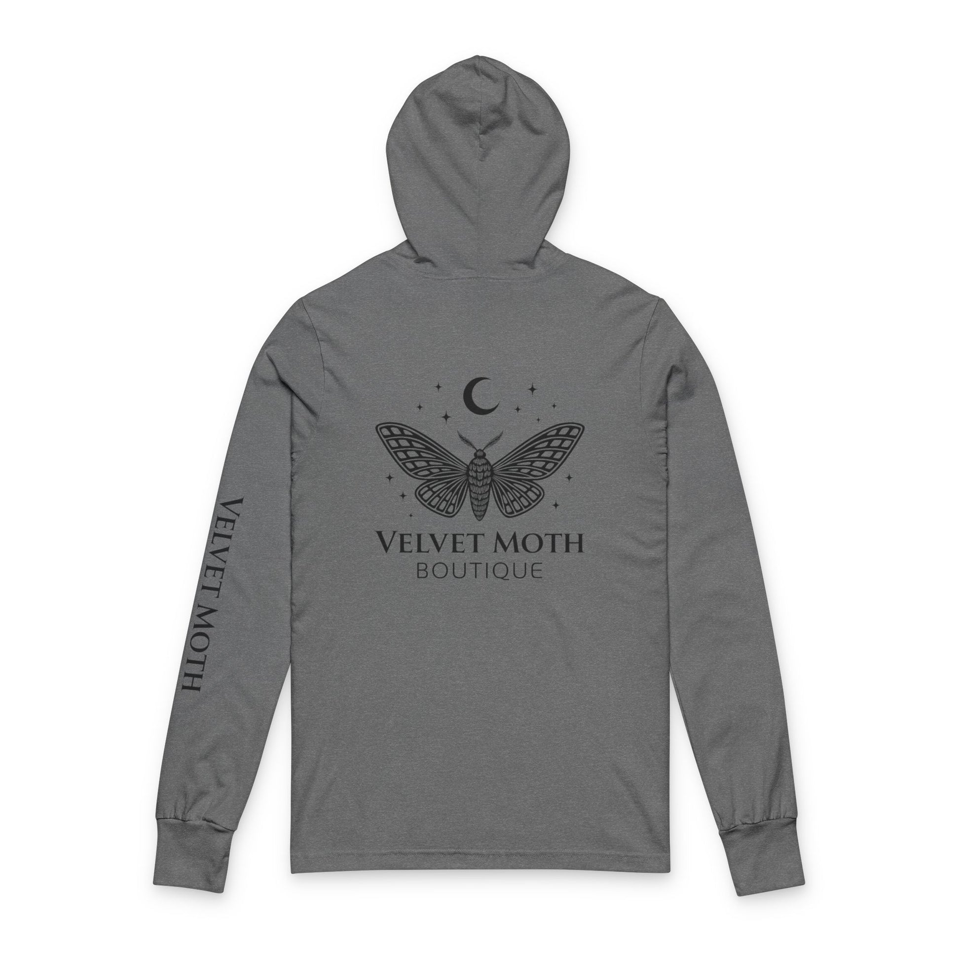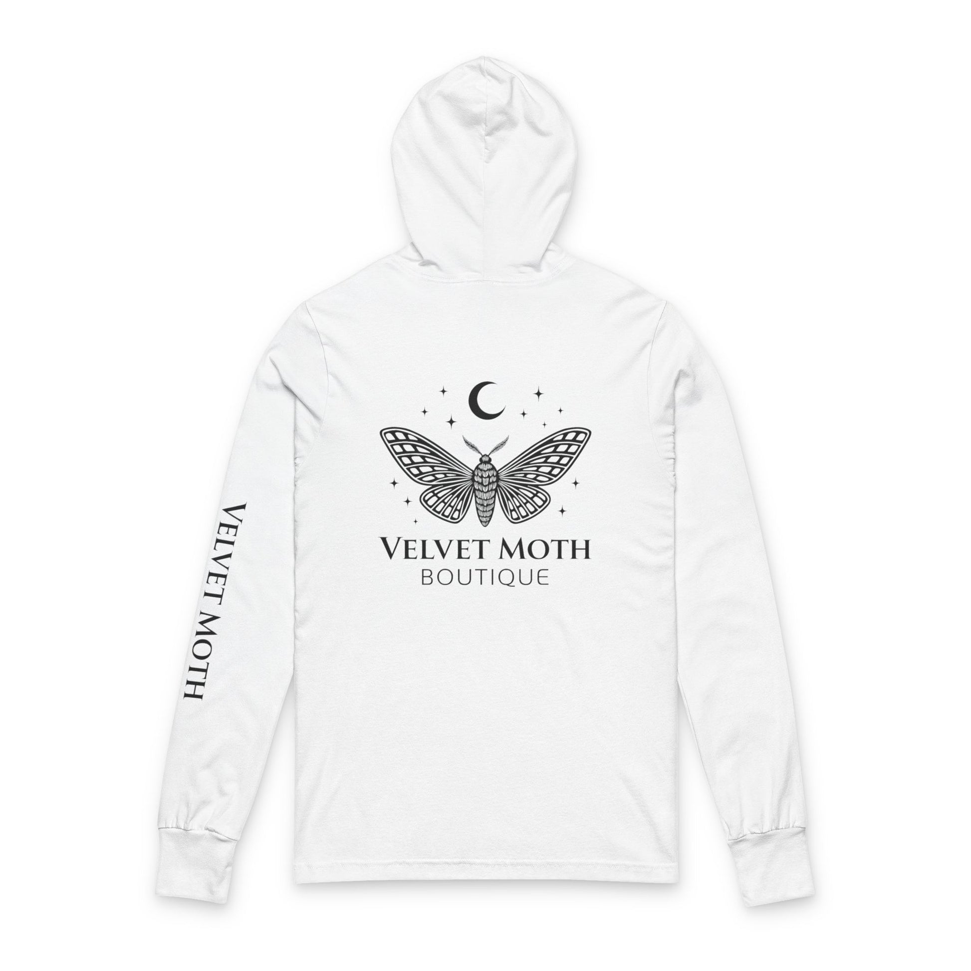 This velvet moth moon and stars long sleeve hooded tee exudes a mystical and magical vibe, perfect for those who love celestial themes. It offers a cozy and casual wear experience, fitting seamlessly into the wardrobe of anyone who enjoys unique and captivating designs. Ideal for star-gazers, nature lovers, and those who appreciate ethereal aesthetics. Perfect for Halloween, stargazing nights, or everyday wear.